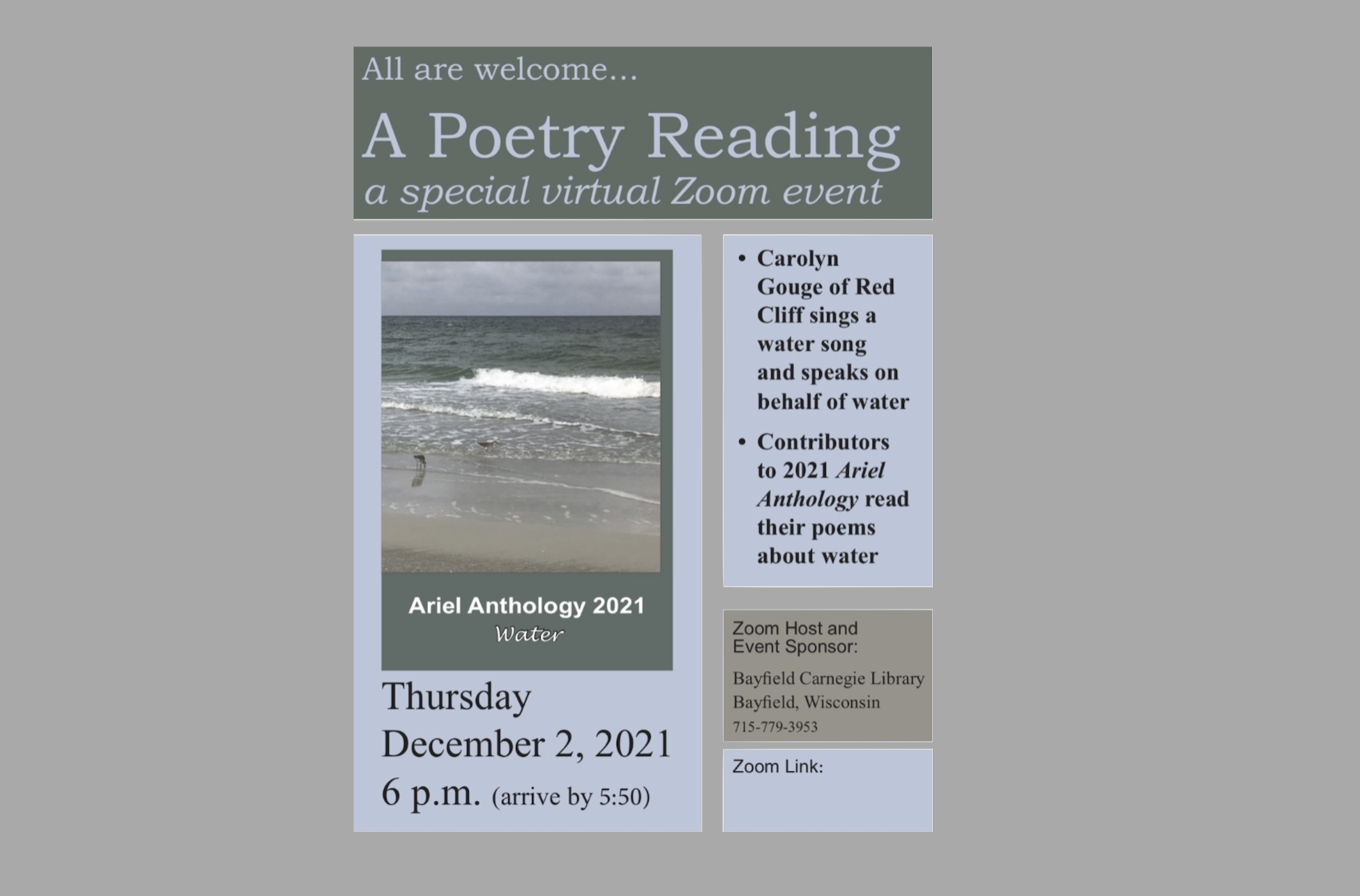 A Poetry Reading via Zoom on December 2, 2021, celebrating the Ariel Anthology 2021: Water.